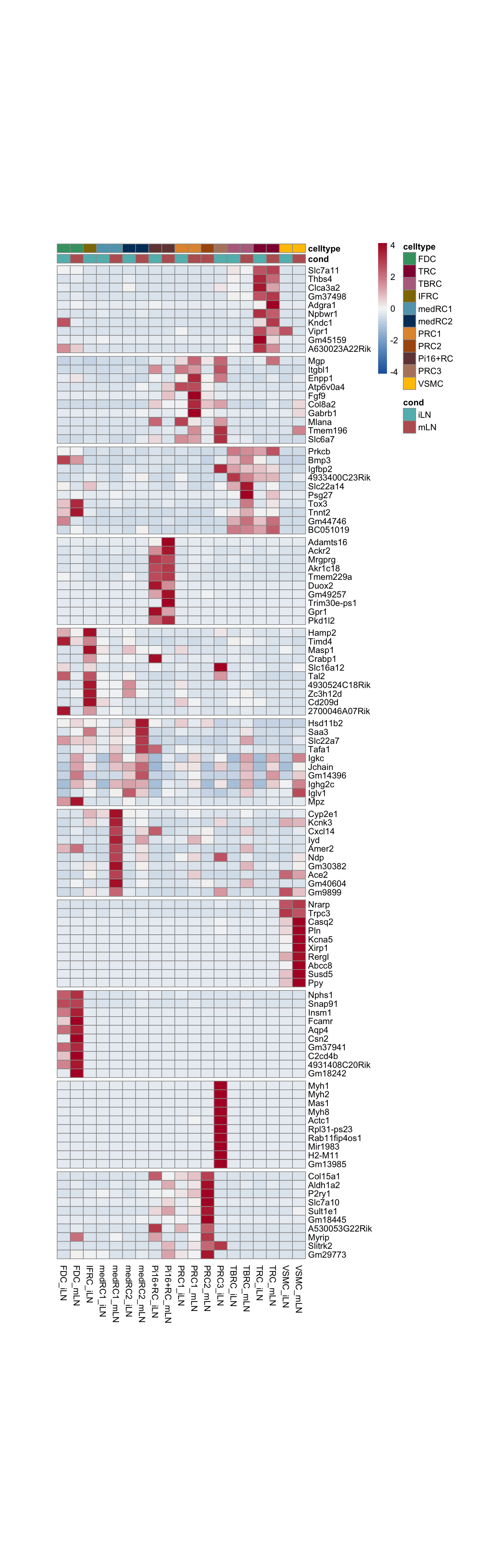 avgHeatmap <- function(seurat, selGenes, colVecIdent, colVecCond=NULL,