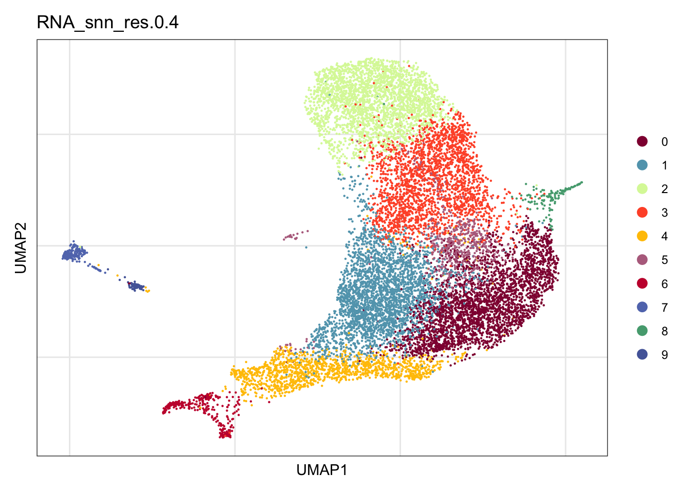 DimPlot(seurat, reduction = "umap", group.by = "RNA_snn_res.0.4",